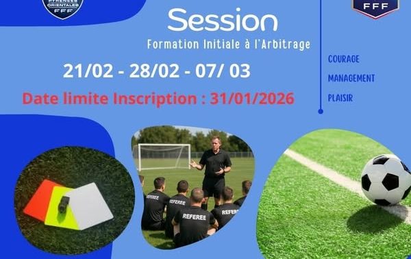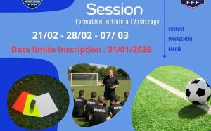 DEVENEZ ARBITRE – FORMATION INITIALE 2026 Vous souhaitez vivre le football autrement et devenir un acteur essentiel du jeu ? La Commission Départementale de l’Arbitrage ouvre une nouvelle session de Formation Initiale à l’Arbitrage (FIA) ! Dates de la formation : Samedi 21 février 2026 Samedi 28 fév...