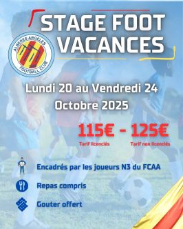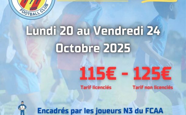 Le FCAA organise une nouvelle session de stage foot pendant les prochaines vacances scolaires. Celle-ci aura lieu du lundi 20 au vendredi 24 Octobre 2025 au stade Éric Cantona.